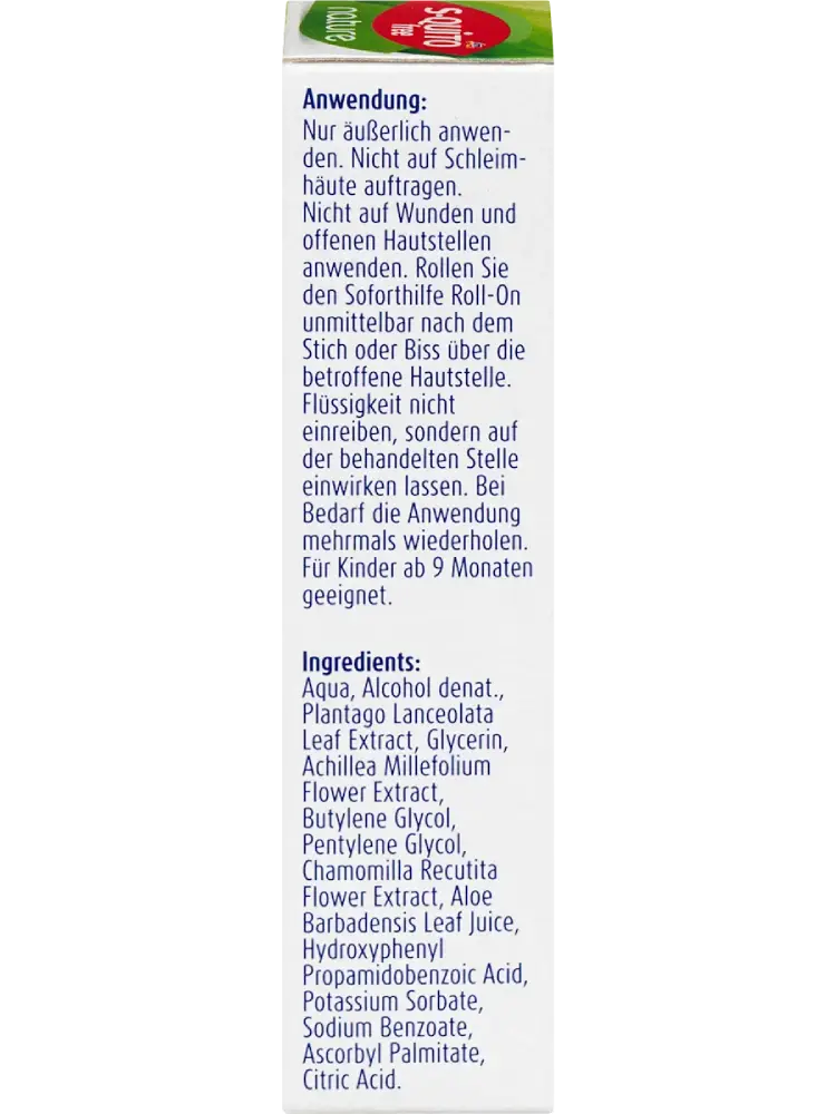 يقدّم رول الأعشاب من S-QUITO free إغاثة فورية مهدئة ومنعشة بعد لسعات الحشرات أو عضّات النمل. يحتوي على SymCalmin® الذي يخفف من الحكة بفعالية، بينما يرطّب الألوفيرا البشرة ويمنحها عناية مركّزة. يتميز بتطبيق كروي من الفولاذ المقاوم للصدأ، مما يعزز من تأثير التبريد أثناء الاستخدام. هذا السائل العشبي النباتي لطيف على البشرة ومثالي للتخفيف السريع من الحكة والانزعاج الناتج عن لسعات الحشرات. مناسب لعلاج موضعي فعّال للمناطق المتهيجة.
