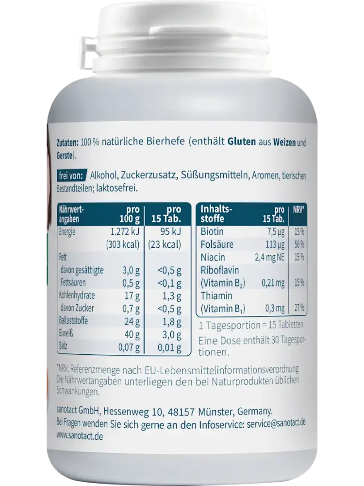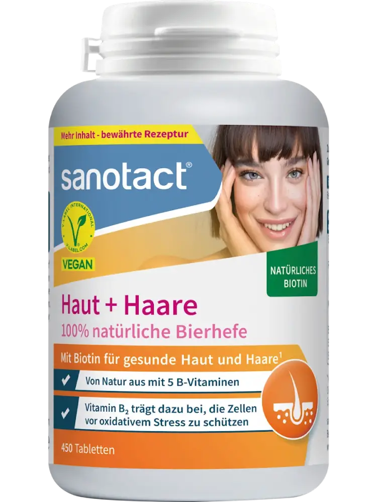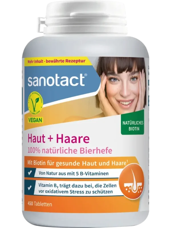 تحتوي أقراص خميرة البيرة للبشرة والشعر من Sanotact على خميرة بيرة طبيعية وتوفر بشكل طبيعي خمسة فيتامينات من مجموعة فيتامين B. يمكن أن يساهم البيوتين الموجود فيها في الحفاظ على بشرة وشعر طبيعيين، بينما يمكن لفيتامين B2 أن يساعد في حماية الخلايا من الإجهاد التأكسدي. كما يمكن لحمض الفوليك والنياسين وفيتامين B2 أن يساهموا في تقليل الشعور بالتعب.