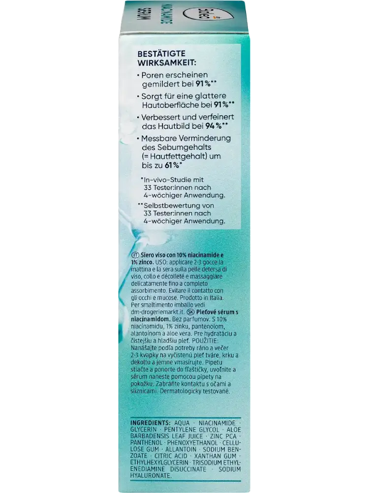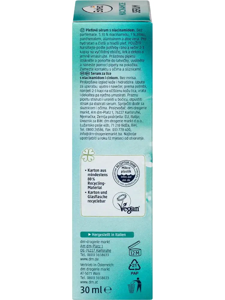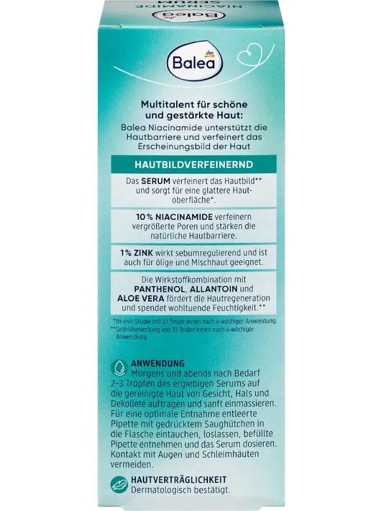 Un soin multifonction pour une peau belle et renforcée : le Niacinamide de Balea soutient la barrière cutanée et affine l’apparence de la peau.