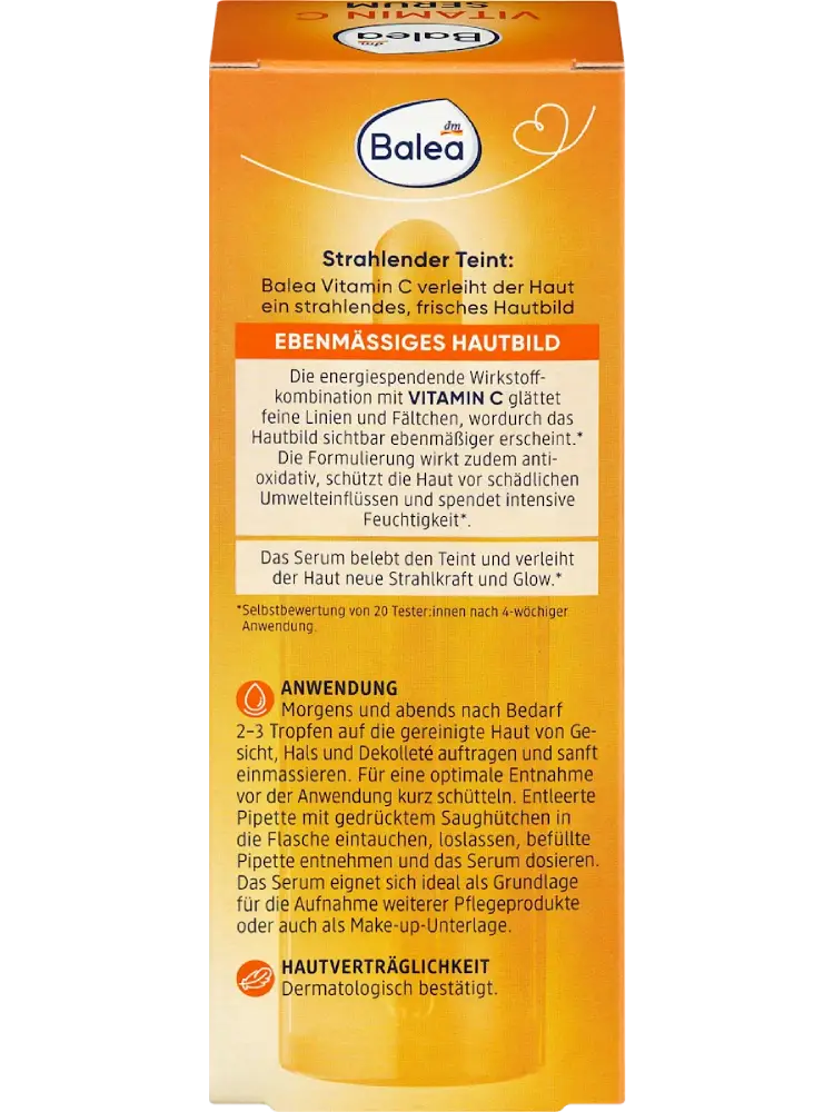 يعمل سيروم فيتامين C من Balea على تنعيم مظهر البشرة. تساعد تركيبة المكونات النشطة التي تمد البشرة بالطاقة مع فيتامين C على تنعيم الخطوط الدقيقة والتجاعيد، مما يجعل مظهر البشرة أكثر تناسقاً بشكل واضح. تحمي التركيبة البشرة من العوامل البيئية الضارة وتوفر ترطيباً مكثفاً. ينعش السيروم البشرة ويمنحها إشراقة وتألقاً جديداً.