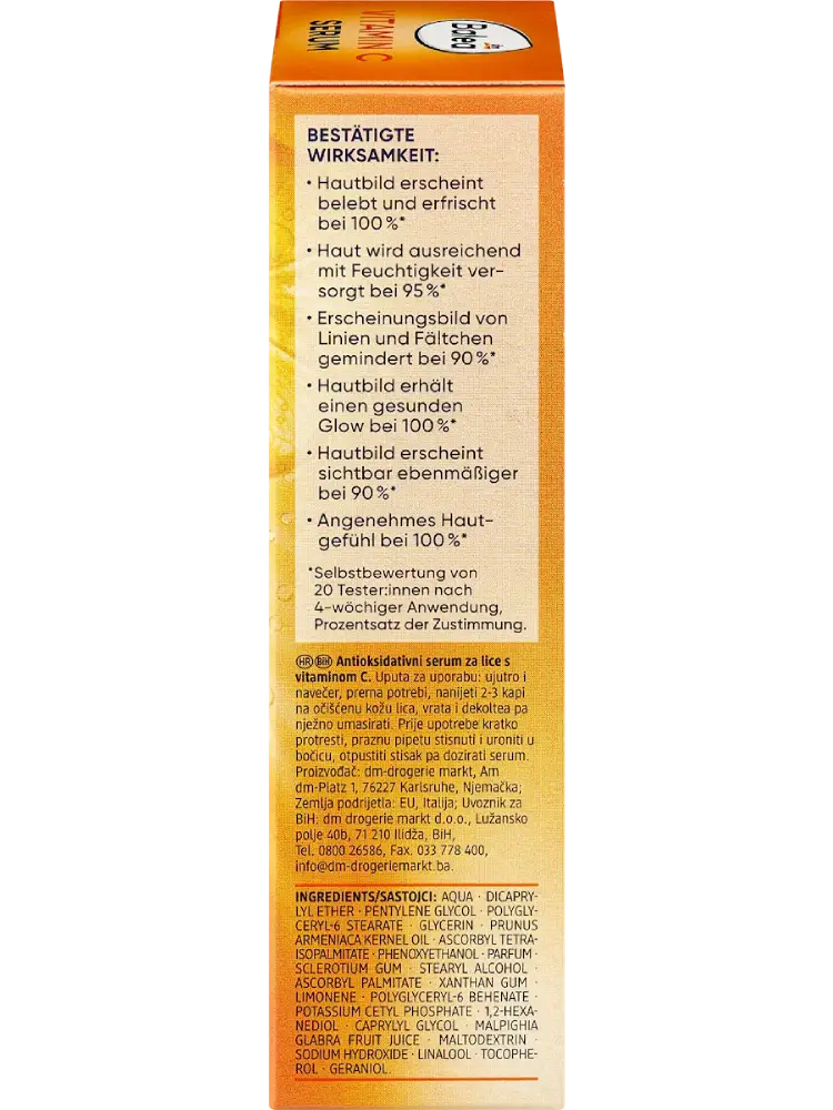 Le sérum à la vitamine C Balea procure un teint lisse. La combinaison d’actifs énergisante avec de la vitamine C lisse les ridules et les petites rides, rendant le teint visiblement plus uniforme. La formulation protège la peau des agressions extérieures et procure une hydratation intense. Le sérum revitalise le teint et apporte à la peau un nouvel éclat et une luminosité naturelle.