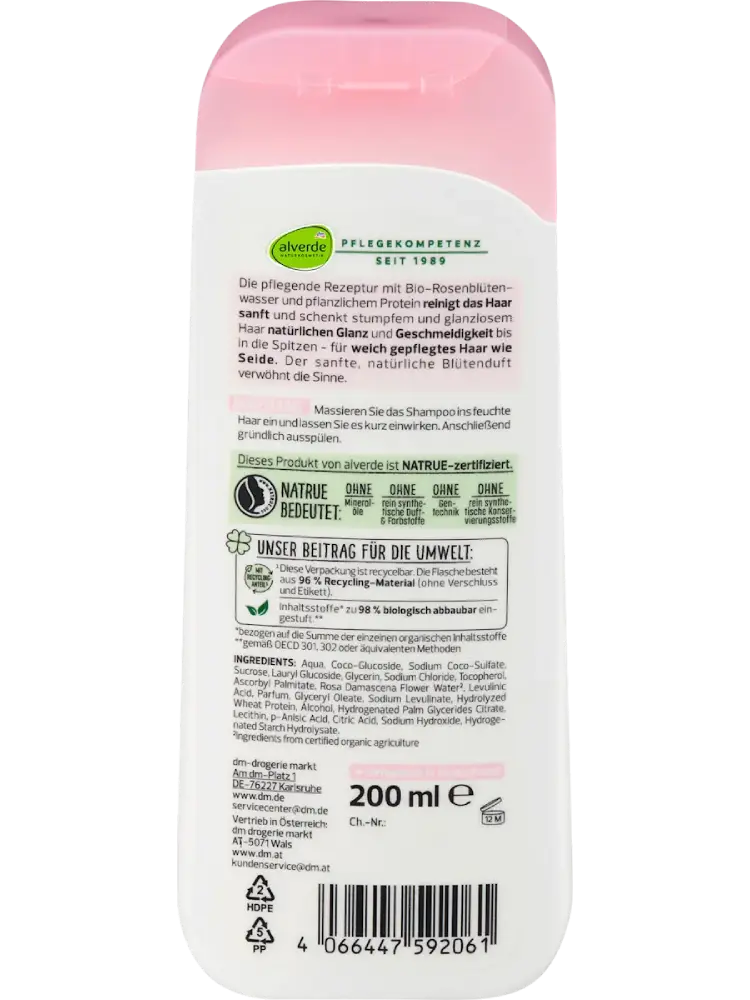 La formule soin au parfum floral doux, composée d’eau de rose bio et de protéines végétales, nettoie les cheveux en douceur et redonne brillance naturelle et souplesse aux cheveux ternes et sans éclat jusqu’aux pointes – pour une chevelure douce et soyeuse. Le délicat parfum floral naturel éveille les sens.