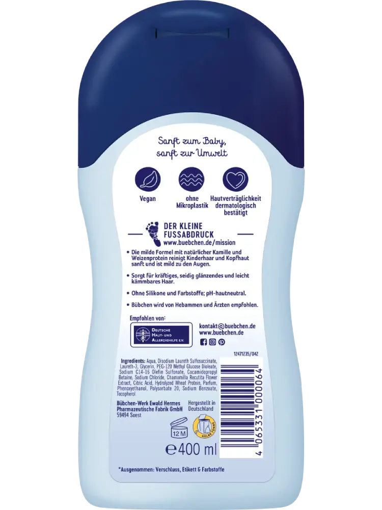 تم تطوير شامبو الأطفال من Bübchen استنادًا إلى خبرة تزيد عن 60 عامًا في تقديم منتجات العناية التي تحمي بشرة الأطفال الحساسة. ينظف الشعر بلطف ويرطب لحماية فروة رأس الطفل الحساسة من الجفاف. بفضل البحث المكثف، والجودة العالية، والاختيار الدقيق للمكونات الطبيعية، تقدم Bübchen لك ولطفلك منتجًا للعناية يعتمد عليه.