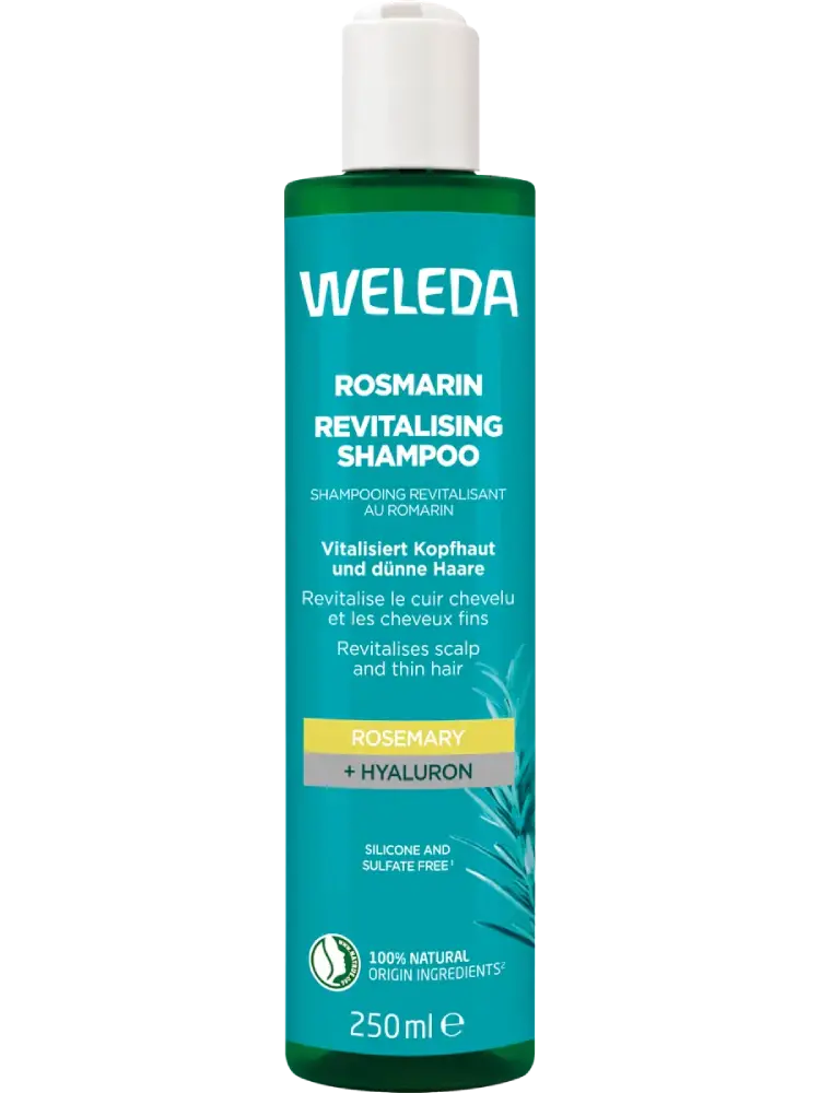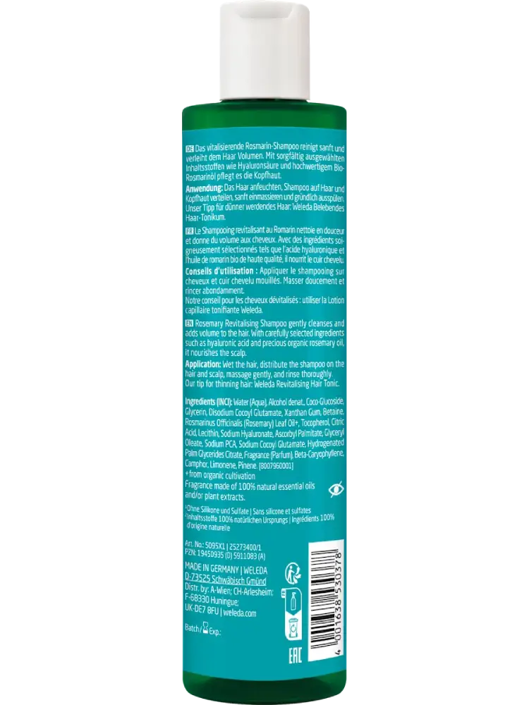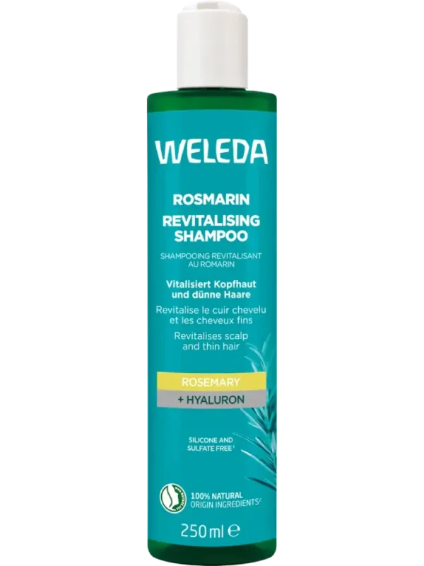 Le shampooing revitalisant au romarin de Weleda offre un soin particulièrement doux pour le cuir chevelu et les cheveux. Enrichi en romarin et acide hyaluronique, il apaise et nourrit le cuir chevelu tout en assurant un nettoyage agréable.