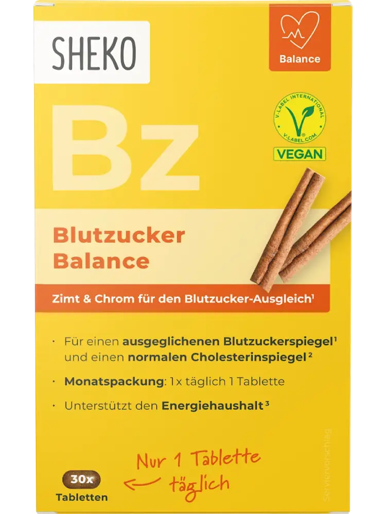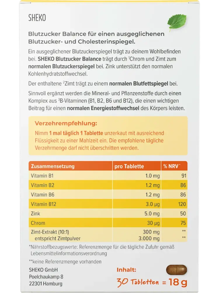 Les comprimés Blutzucker Balance de SHEKO contiennent une combinaison équilibrée de chrome et de cannelle, pouvant contribuer au maintien d’un taux de glycémie normal. Le zinc peut soutenir un métabolisme normal des glucides, tandis que la cannelle peut également contribuer au maintien d’un taux normal de lipides sanguins. La formule est complétée par un complexe de vitamines B (B1, B2, B6 et B12), qui participent au métabolisme énergétique normal.