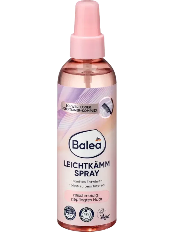 يعمل بخاخ فك تشابك الشعر من Balea على تسهيل تسريح الشعر، مما يجعله أكثر نعومة ولمعانًا. يناسب جميع أنواع الشعر، كما أن تركيبته الخفيفة تغذي الشعر بلطف دون إثقاله، مما يساعد في فك العقد الصغيرة بسهولة دون شدّ أو إزعاج.