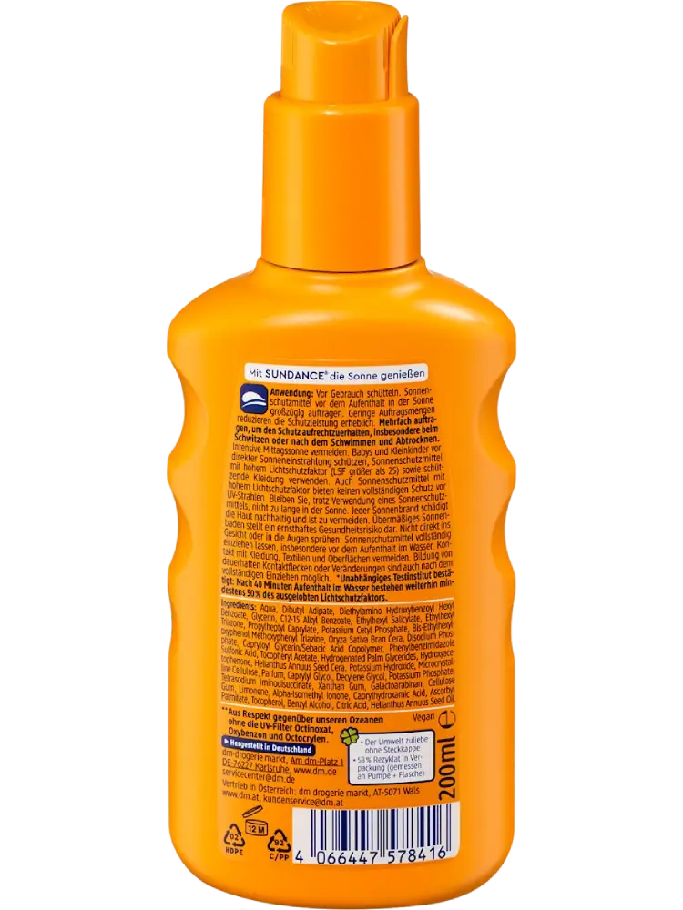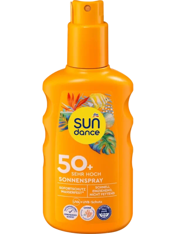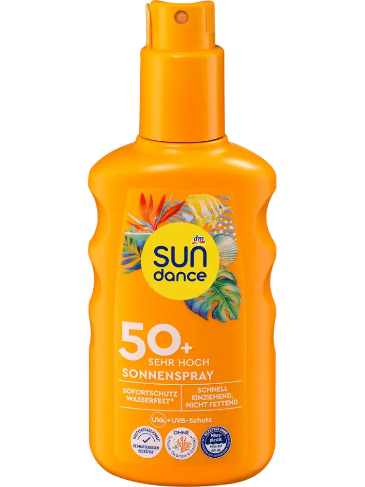 Le spray solaire SUNDANCE SPF 50+ aide, en cas d’utilisation régulière, à prévenir le vieillissement cutané prématuré dû au soleil ainsi que l’apparition de taches pigmentaires. Tolérance cutanée confirmée dermatologiquement. Résistant à l’eau* (*Institut de test indépendant confirmé : après 40 minutes dans l’eau, au moins 50 % du facteur de protection solaire annoncé est encore maintenu). Par respect pour les océans, sans filtres UV Octinoxate, Oxybenzone et Octocrylène. Végan.