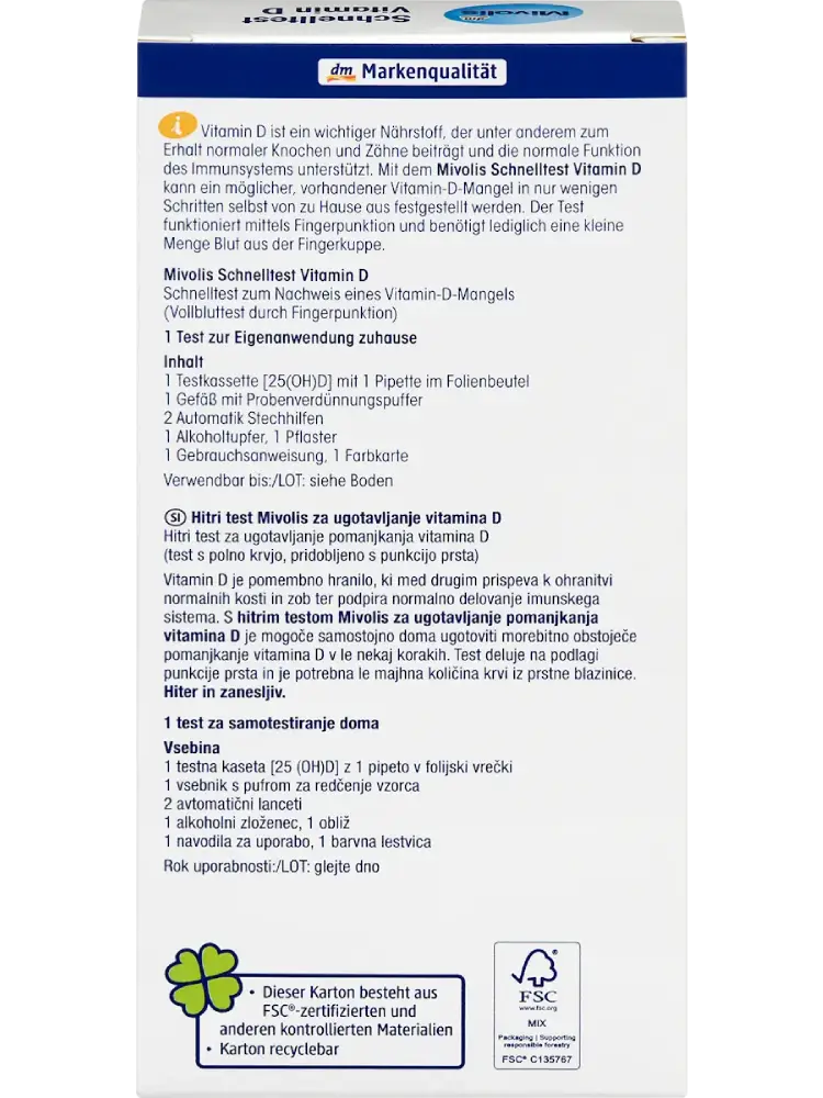 يعد فيتامين د عنصرًا غذائيًا مهمًا يساهم في الحفاظ على صحة العظام والأسنان ويدعم الوظيفة الطبيعية لجهاز المناعة. باستخدام اختبار Mivolis السريع لفيتامين د، يمكن اكتشاف نقص محتمل في فيتامين د ببضع خطوات بسيطة من المنزل. يعمل الاختبار عن طريق وخز الإصبع ويحتاج فقط إلى كمية صغيرة من الدم من طرف الإصبع.