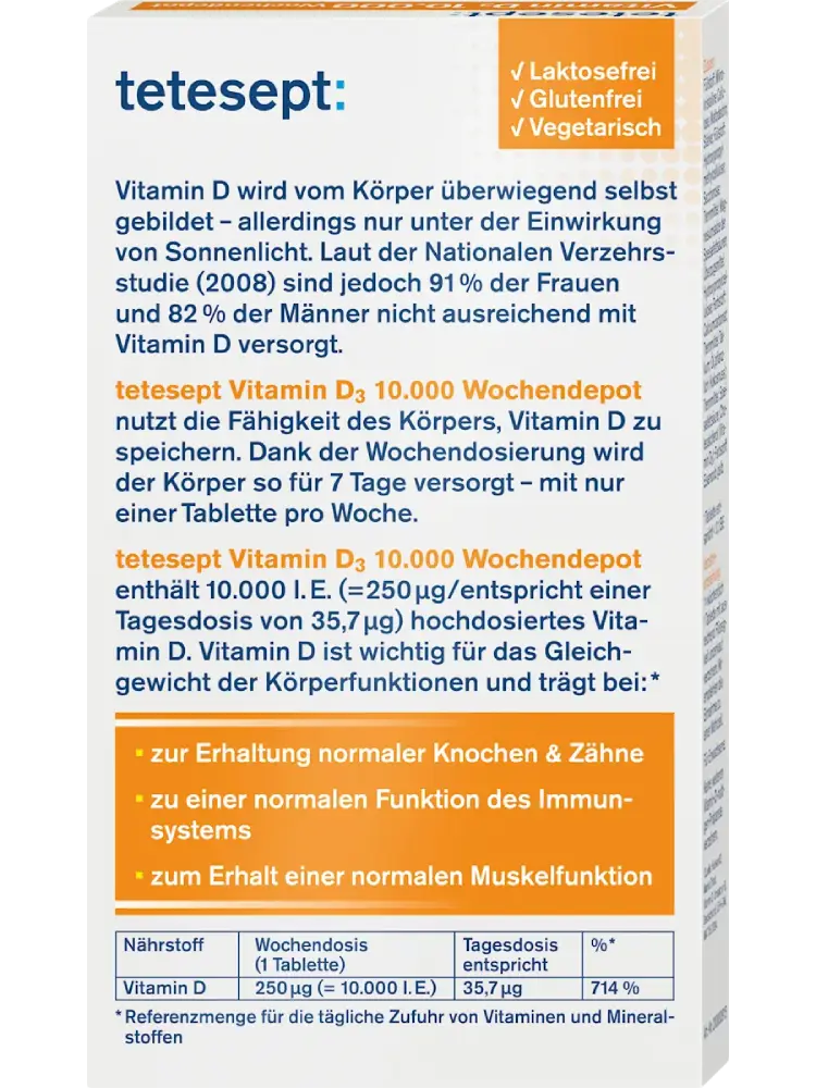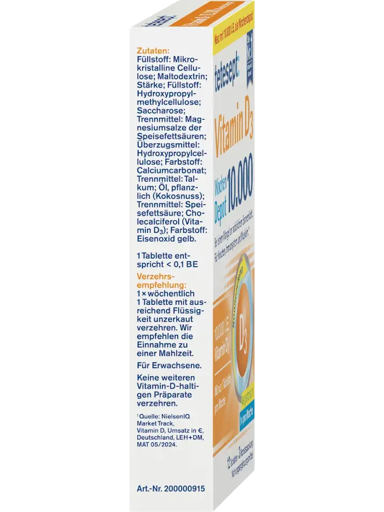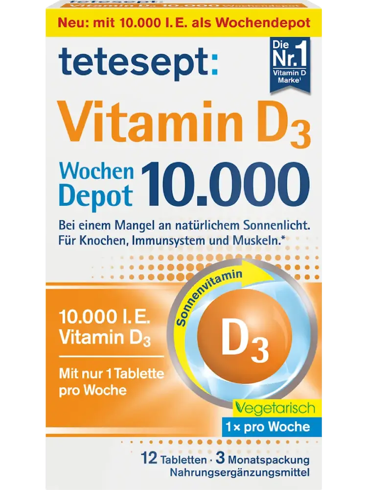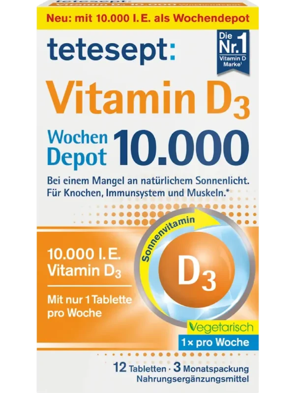 تُعد أقراص فيتامين D3 بجرعة 10,000 وحدة دولية أسبوعية من tetesept مكملًا غذائيًا عمليًا تم تطويره خصيصًا لدعم الجسم في حالات نقص التعرض لأشعة الشمس الطبيعية.