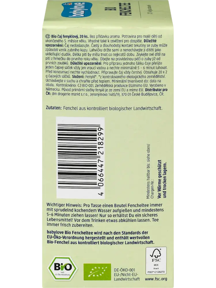 La tisane au fenouil de babylove, composée d’ingrédients bio naturels, a un goût particulièrement doux. Elle convient dès le 5e mois et peut être dégustée comme boisson aromatique, aussi bien froide que chaude.