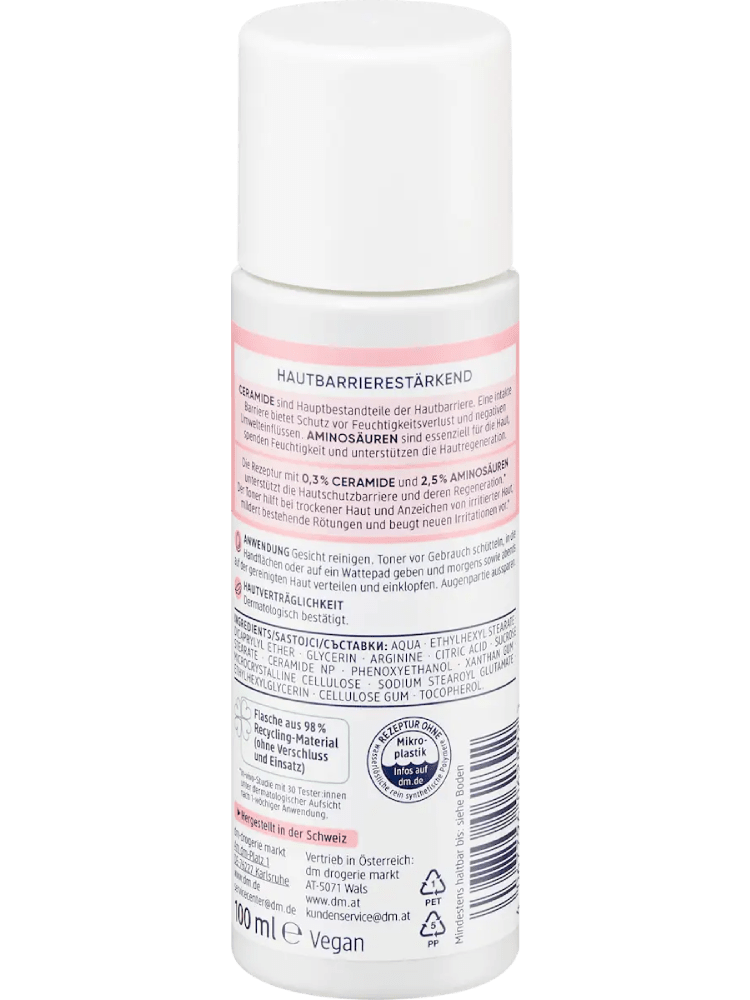 Balea Beauty Expert propose des soins efficaces aux ingrédients concentrés, parfaitement adaptés aux besoins de la peau. Les CÉRAMIDES sont les principaux composants de la barrière cutanée. Une barrière intacte offre une protection contre la perte d’humidité et les influences environnementales négatives. LES ACIDES AMINÉS sont essentiels pour la peau, hydratent et favorisent la régénération cutanée. La formule avec 0,3% de CÉRAMIDE et 2,5% d’ACIDES AMINÉS soutient la barrière protectrice de la peau et sa régénération.* Le tonique aide en cas de peau sèche et de signes de peau irritée, réduit les rougeurs existantes et prévient de nouvelles irritations.* *Étude in vivo auprès de 30 testeurs sous surveillance dermatologique après 1 semaine d’utilisation. Valeur pH : 5,8 Recette sans microplastiques ni polymères hydrosolubles purement synthétiques.