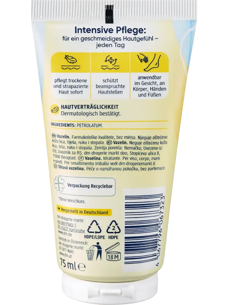 La vaseline Balea en tube prend soin de la peau irritée en douceur. Elle est applicable sur la peau sollicitée du visage, du corps, des mains et des pieds. Ainsi, la peau reste douce – chaque jour. La formule est vegan et sans parfum. La tolérance cutanée est également confirmée dermatologiquement.