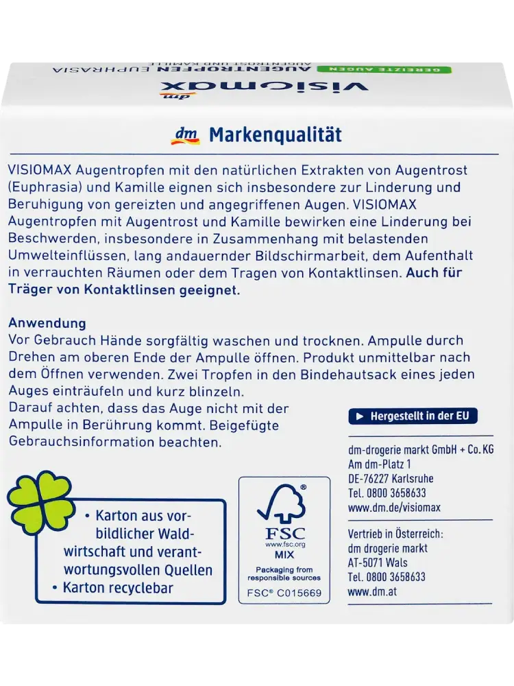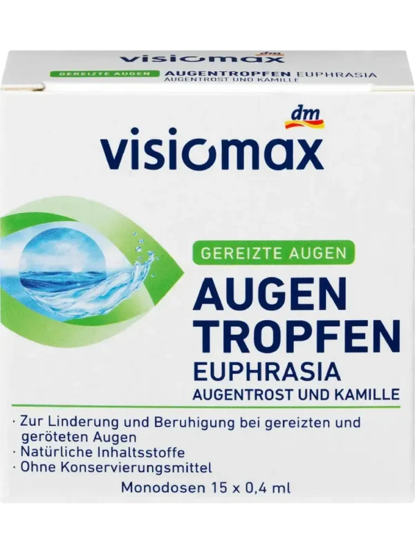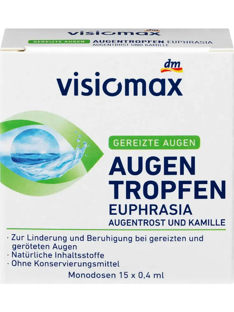 Les gouttes oculaires VISIOMAX, à base d’extraits naturels d’euphraise (Euphrasia) et de camomille, sont particulièrement adaptées pour soulager et apaiser les yeux irrités et fatigués. Les inconforts peuvent être liés à des facteurs environnementaux, à un travail prolongé sur écran, à un séjour dans des pièces enfumées ou encore au port de lentilles de contact.