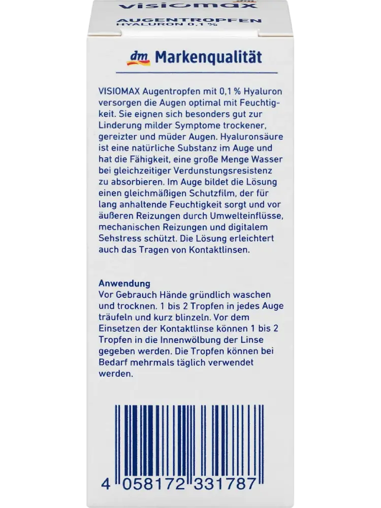 توفر قطرات العين VISIOMAX مع 0.1٪ من حمض الهيالورونيك ترطيبًا مثاليًا للعينين. حيث تشكل في العين طبقة حماية متجانسة تمنح ترطيبًا طويل الأمد وتساعد على الحماية من التهيجات الخارجية (مثل العوامل البيئية أو التهيج الميكانيكي أو إجهاد العين الناتج عن استخدام الشاشات). كما تساعد على تسهيل ارتداء العدسات اللاصقة