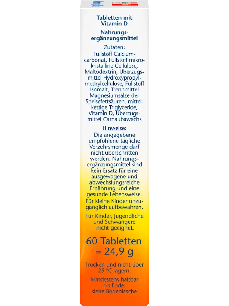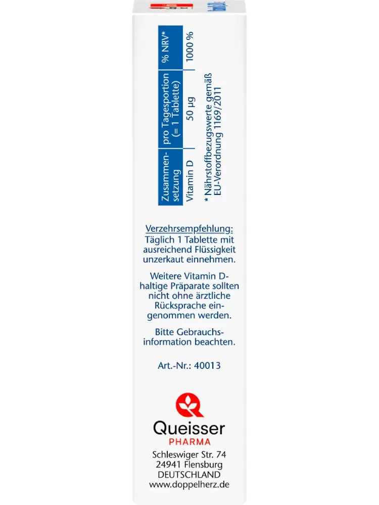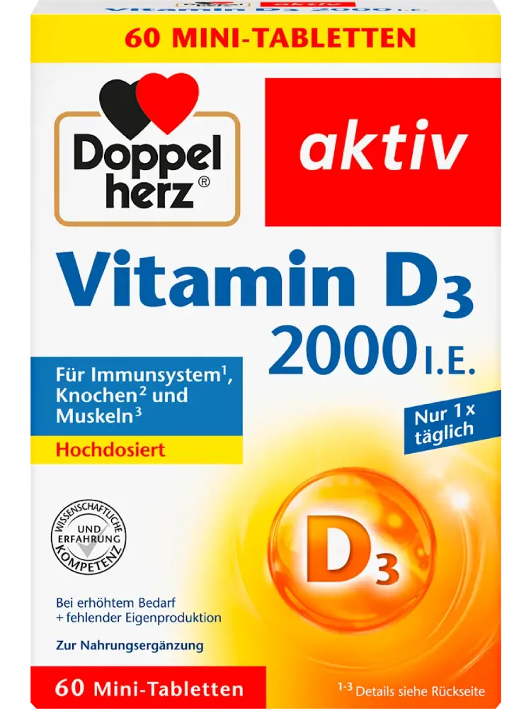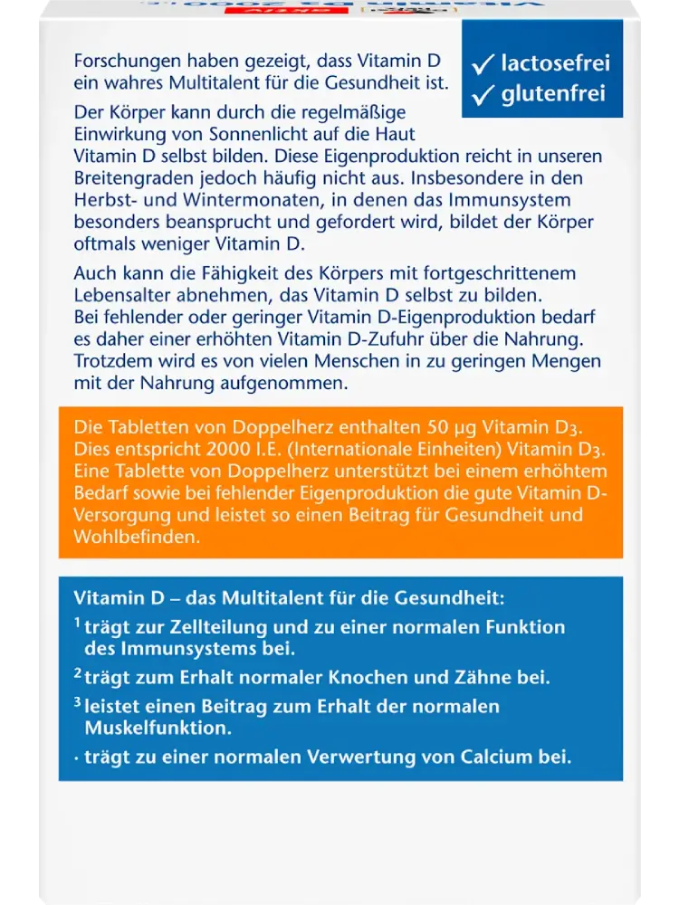 تحتوي أقراص فيتامين D3 من Doppelherz على 50 ميكروغرام من فيتامين D3، ما يعادل 2000 وحدة دولية. تساهم قرص واحد من Doppelherz في تلبية الحاجة المتزايدة عند نقص الإنتاج الذاتي، مما يضمن توفير جيد لفيتامين D ويساهم في الصحة والرفاهية. يمكن للجسم إنتاج فيتامين D بشكل طبيعي عند التعرض المنتظم لأشعة الشمس على الجلد. ولكن غالبًا ما يكون هذا الإنتاج غير كافٍ في مناطقنا. خاصة في أشهر الخريف والشتاء، عندما يكون الجهاز المناعي معرضًا للإجهاد بشكل خاص، قد يكون من المفيد تناول مكمل إضافي.