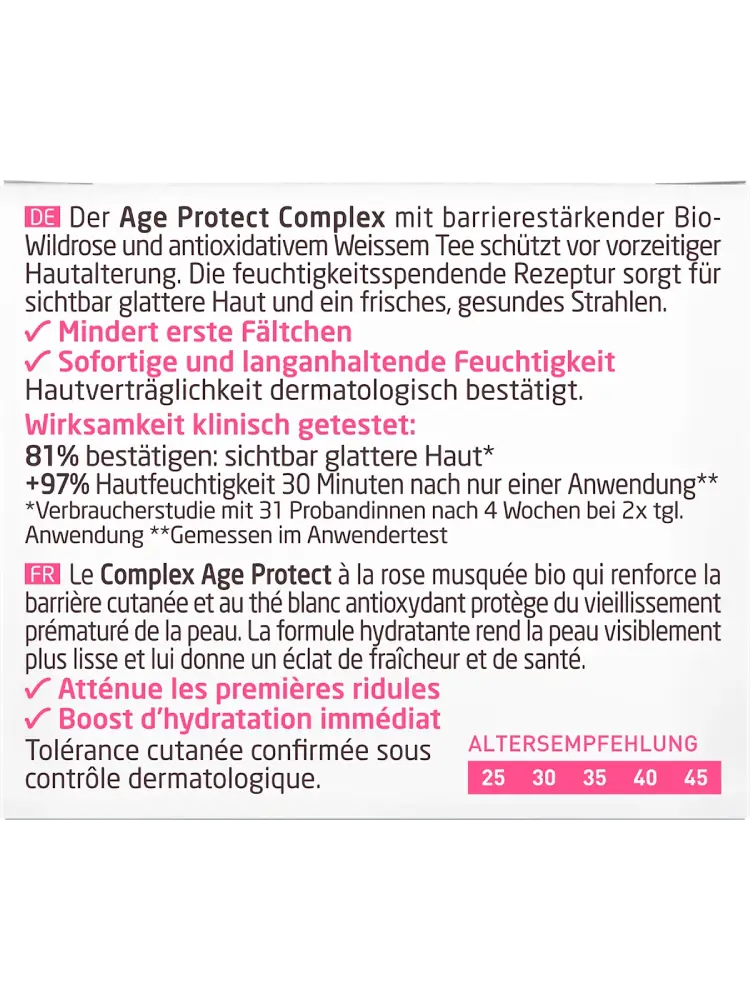 Elle est enrichie en Age Protect Complex avec de la rose musquée bio et du thé blanc antioxydant, qui aident à protéger la peau contre le vieillissement prématuré.